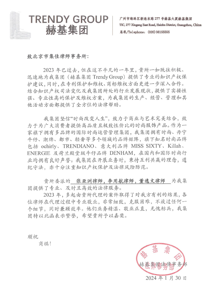信中提到,2023年,集佳与赫基集团在专利保护和维权、商标维权方面更进一步加强合作,集佳一如既往、迅速地为赫基集团提供了专业的知识产权保护建议,集佳提供的实操性强、专业性高的保护及维权方案,为赫基集团的生产、经营、管理和其他活动方面都提供了全方位的法律帮助。赫基集团法务部赞扬集佳张亚洲律师李用航律师董逸文律师徐思律师、商标代理人杜梦寒等,在提供专业、及时且高效的法律服务的过程中,厚德重法,业务精湛,敬业正直,无愧标兵。