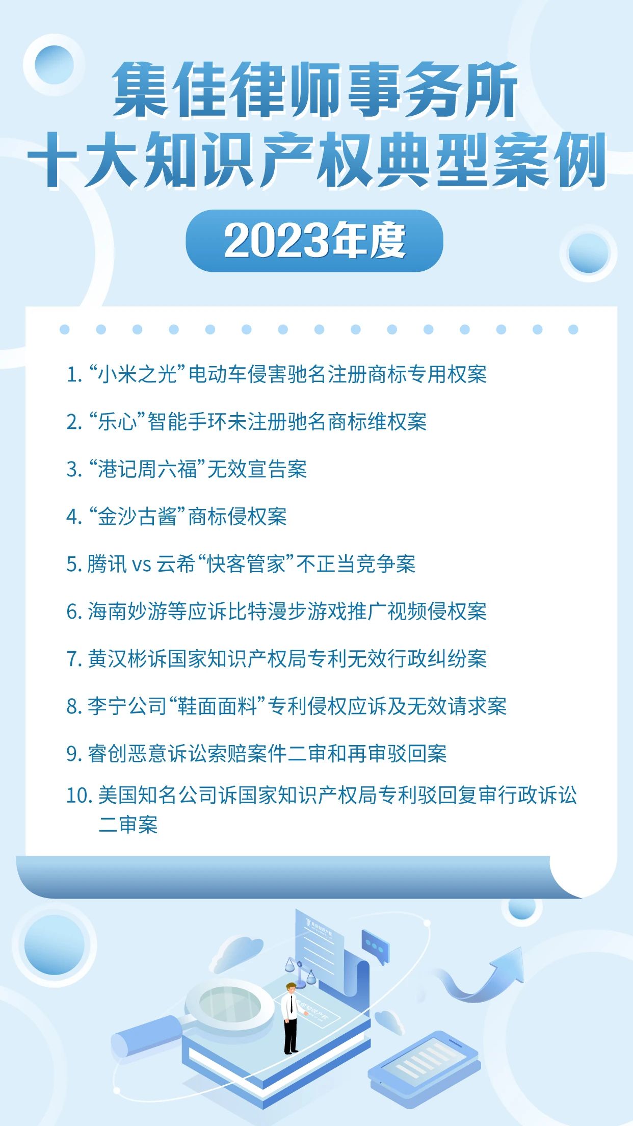作为迎接4.26世界知识产权日的献礼之一,澳客 已连续十年开展十大知识产权典型案例的评选活动,其意义不仅在于展现集佳律师团队的专业能力和水准,更在于传递集佳全方位服务客户的理念。在第24个世界知识产权日来临之际,澳客 从2023年度代理的众多知识产权案件中筛选出具有代表性的十大案例,与各界同仁分享:
