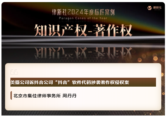 澳客 凭借在知识产权保护领域卓越的专业实力与良好的行业口碑,入选《律所卓越品牌影响力指南(2024)》,荣获“律新社2024年度精品品牌律所30佳”奖项;同时,集佳周丹丹律师代理的“美摄公司诉抖音公司'抖音'软件代码抄袭著作权侵权案”获评“律新社2024年度标杆案例:知识产权-著作权领域”。