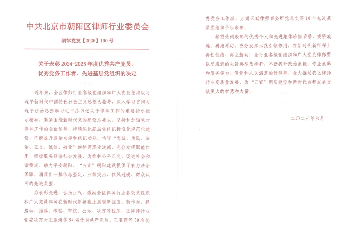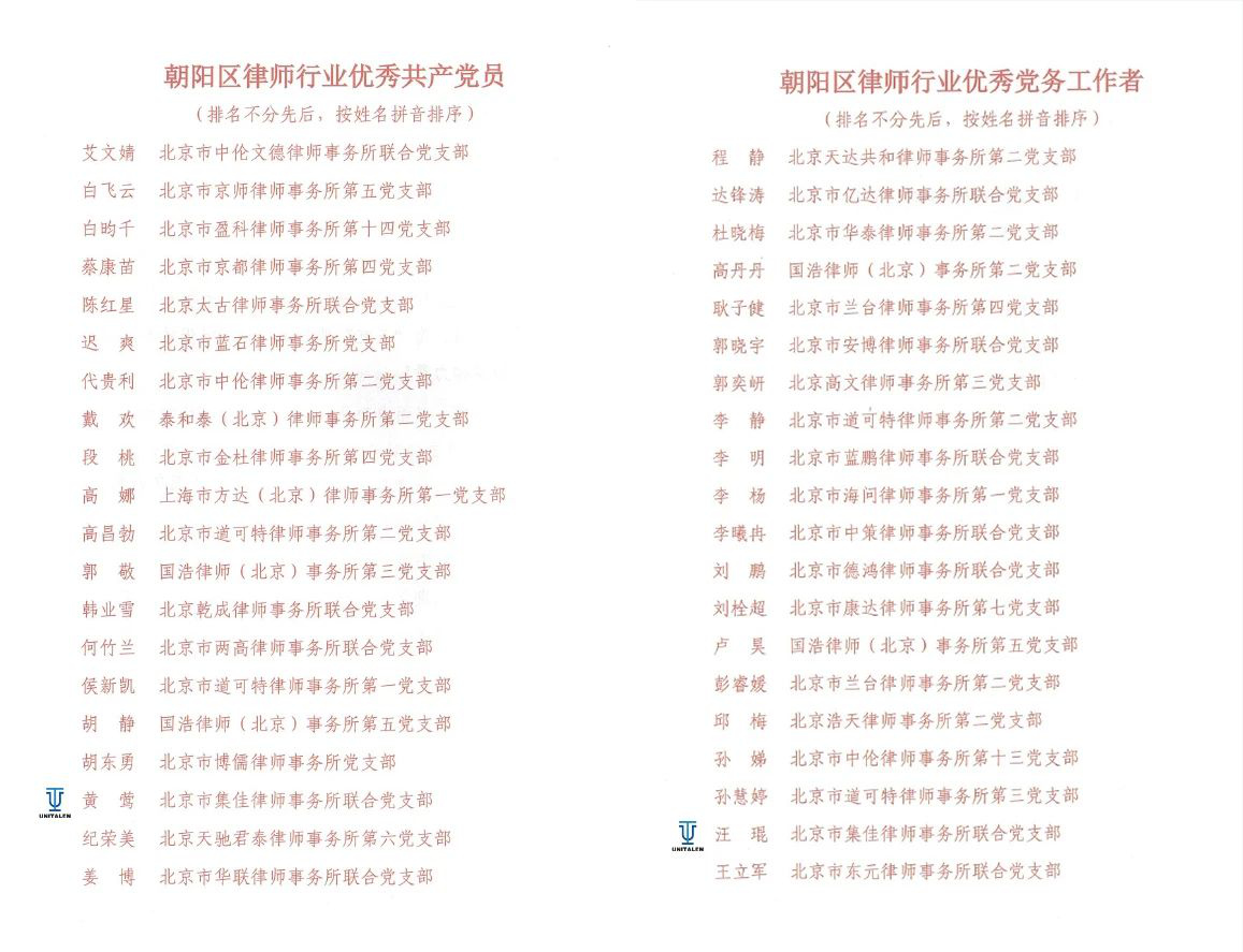 6月27日,朝阳区律师行业党委召开了朝阳区律师行业庆祝中国共产党成立104周年暨总结表彰大会,澳客 联合党支部党员黄莺荣获“朝阳区律师行业优秀共产党员”称号,支部党员汪琨荣获“朝阳区律师行业优秀党务工作者”称号。
